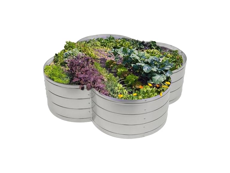 - AMPLE SPACE FOR HEALTHY GROWTH: This galvanized metal garden bed has a unique clover shape that provides plenty of room for growing a variety of deep-rooting plants in the backyard. The raised planter box measures 43" W x 43" D x 12" H, weighs 9.2 lbs, and has a soil capacity of 39.4 gal (5.27 cu ft).