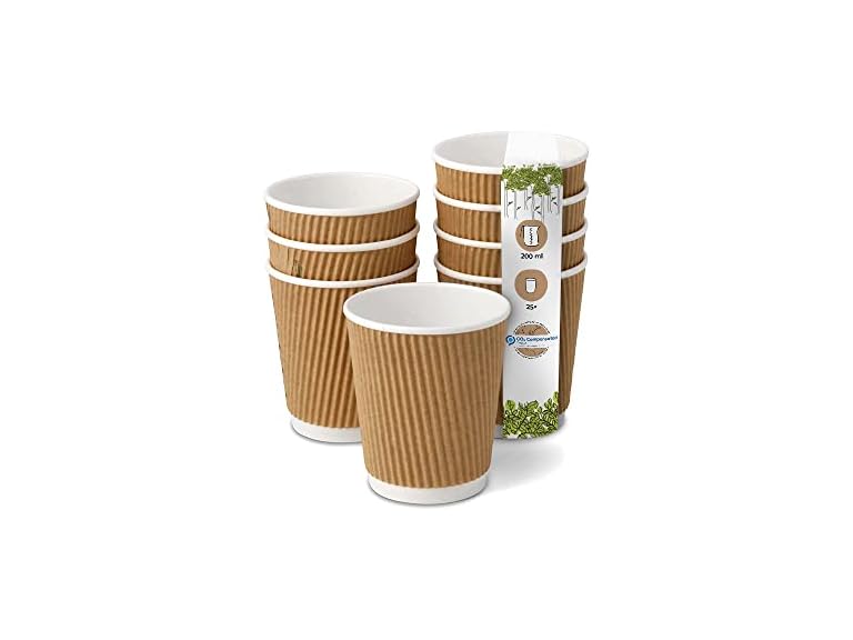 - (1) BIOZOYG Pack of 25 Coffee Cups Insulated Paper Cups 200 ml / 8 oz Diameter 80 mm White/Brown - Ribbed Plastic-Free Sustainable Materials - Disposable Cups Mulled Wine Cups