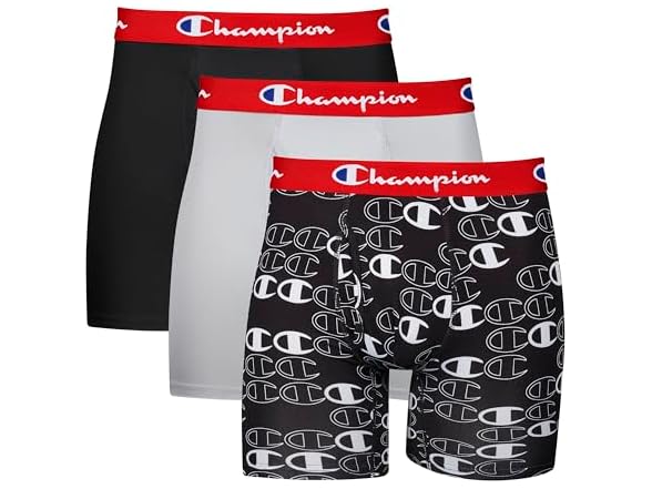 - SIGNATURE WAISTBAND: Features a wide, exposed elastic waistband with the iconic Champion script logo, designed for a secure hold and bold style. The stay-put construction helps prevent ride-ups, so these boxer briefs stay comfortably in place all day long.