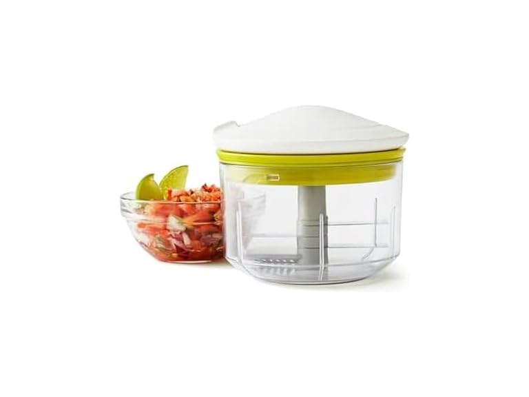 - (1) Chef’n VeggiChop Manual Hand-Powered Food Chopper and Processor, Chops Vegetables, Onions, Peppers, Nuts for Salsa, Guacamole, Hummus – White