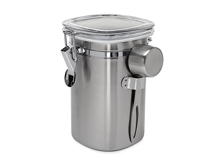 (1) ChefWave Durable Stainless Steel Coffee Canister with Measuring Spoon, Convenient Spoon Holder and Secure Locking Mechanism - Keeps coffee fresh for longer