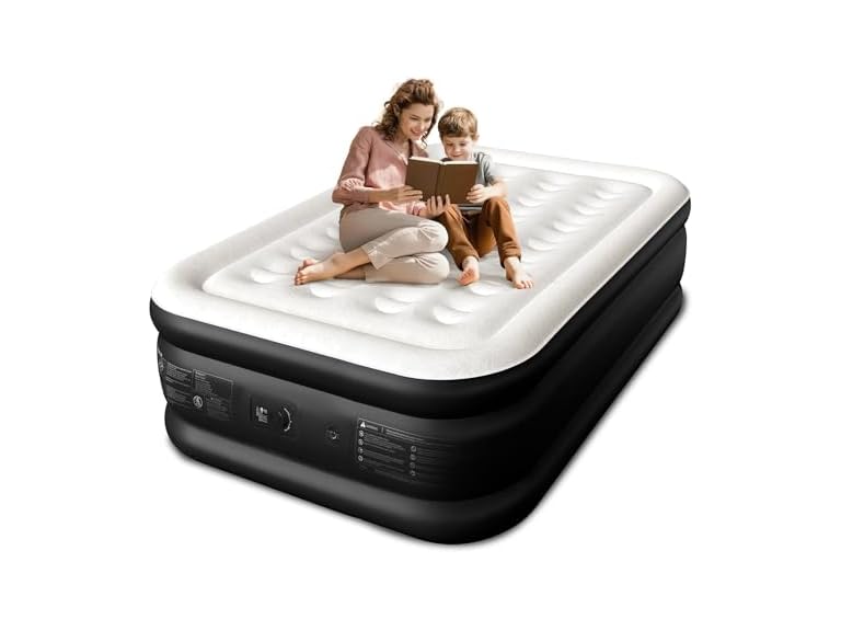 - Luxury Pillow-Top Design for Hotel-Like Comfort: The sleek, grooved top mimics the look and feel of a premium pillow-top mattress. Made with 0.2mm ultra-soft flocked fabric and 0.4mm puncture-resistant PVC, this full air mattress with built in pump provides skin-friendly comfort and exceptional durability—even with daily use