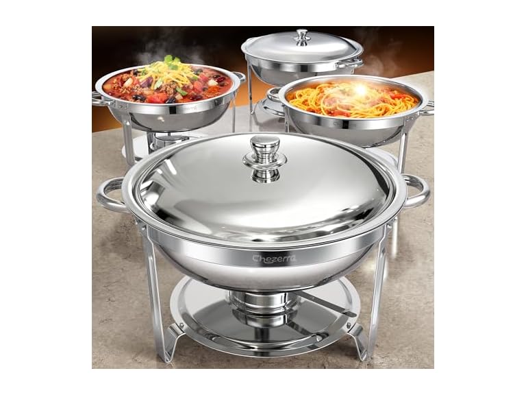 - Complete Chafing Dish Set: The Chezerra Chafing Dish Set offers an effortless and convenient dining solution. Crafted from premium 201 stainless steel with excellent thermal conductivity, it ensures long-lasting heat retention. The set includes FOUR spacious 5QT containers, making it ideal for parties