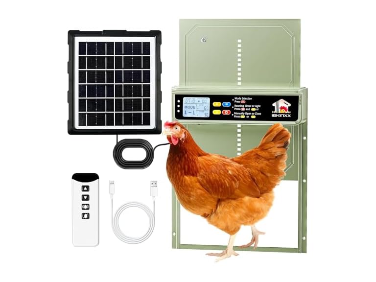 - Anti-Pinch & Intrusion Alarm: Our solar-powered automatic chicken door features anti-pinch function—if it senses a chicken underneath, it automatically reverses to prevent injury. Plus, it comes with a built-in intrusion alarm that sounds if the door is forced open, scaring off predators and alerting you immediately