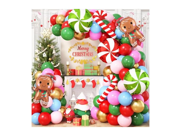- Package Includes - You will get: 3pcs 18 inch round pinwheel balloons(red*1, green*2); 2pcs mini gingerbread man foil balloons; 2pcs mini red candy cane foil balloons; 100pcs 10 inch balloons(baby pink*15, pale pink*15, light blue*15, dark green*20, red*20, metallic gold*15); 1pc balloon strip tape and 100 dots of dispensing.