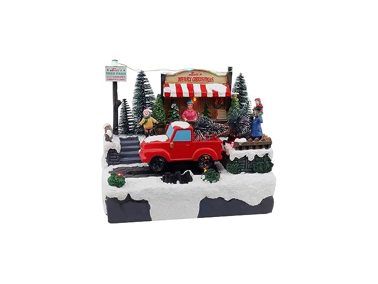 - SPECIFICATIONS – The red truck with a tree in its trunk gracefully sways back and forth in a snowy Christmas tree farm to the tune of 8 different Christmas songs. The changing lights add a magical touch to the scene, reminiscent of the joyous adventure of picking out the perfect Christmas tree. This Snow Village is operated with Operated with 3 x AA Battery (NOT INCLUDED). You can place it anywhere you want, and design your own Christmas Village Display Indoor or Outdoor! Product size: 8.1 x 5.3 x 7.7 In.