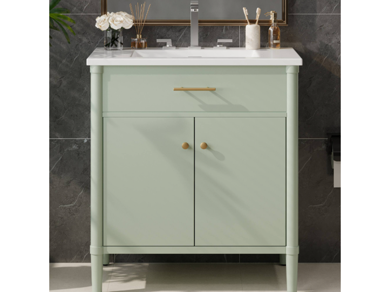 Premium Wood Construction: Crafted with MDF and rubber wood legs, this bathroom vanity cabinet ensures long-lasting strength, moisture resistance, and stability in humid environments. Elegant Hardware Finishes: Accented with matte gold handles, this vanity adds a subtle luxury touch that blends easily with modern, minimalist, or transitional bathrooms.