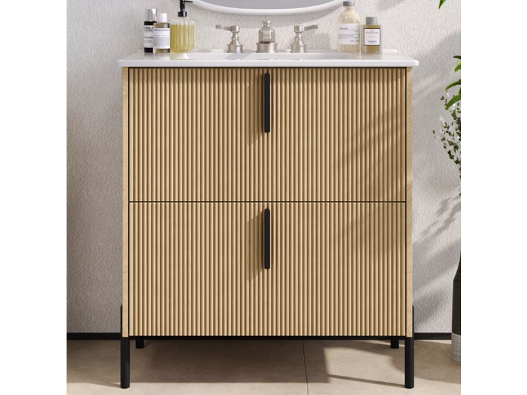 Designed to elevate modern bathrooms, this vanity features a clean silhouette with sleek black pulls and a handcrafted fluted finish for visual depth. The integrated ceramic sink resists stains and scratches while maintaining a glossy look and minimizing water splashes. Full-extension soft-close drawers offer ample storage space for all your essentials, combining convenience with quiet functionality. Thoughtfully crafted vertical grooves add artisanal charm and resist fingerprints for easy care. With user-friendly assembly and a timeless monochrome palette, this vanity blends style, function, and ease, perfect for contemporary spaces that value both form and performance.
