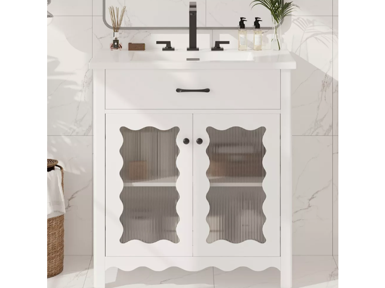 - (1) Christopher Knight Home Wiro Modern 31" Bathroom Vanity with Ceramic Sink, Tempered Glass Doors and Adjustable Shelves -Choose Color