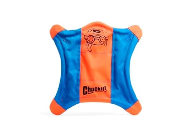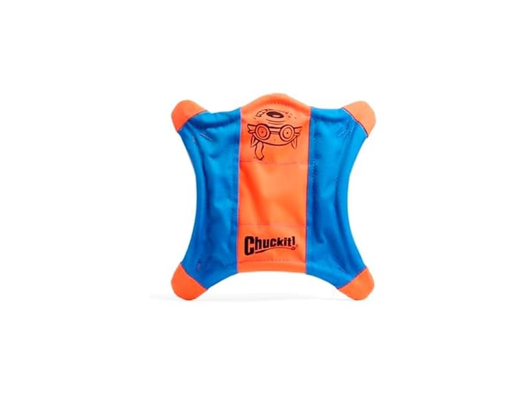 - (1) Chuckit! Flying Squirrel Fetch Dog Toy - Water Floating Flyer - Soft and Durable Polyester Canvas Construction - For Medium Dogs - Size Medium - 9.5-inch Diameter - Pack of 1 - Orange and Blue