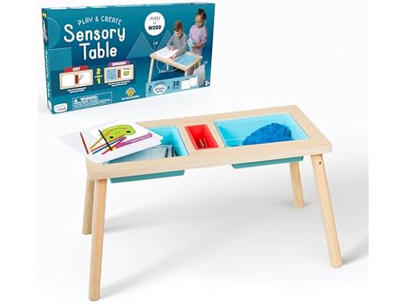 - WHAT’S INCLUDED: Wooden Sensory Table with 3 bins, 30 Learn & Play activity cards, 3 Dry Erase Markers, 2 pounds of Super Soft Dream Sand, and lids for each larger bin.