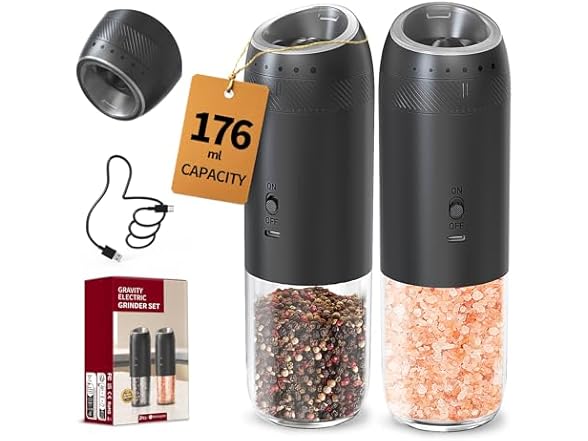 - CIRCLE JOY Gravity Electric Salt and Pepper Grinder Set Rechargeable Automatic Pepper Mill Grinders with 176ml Container, External Adjustable Coarseness, Bright LED Light and One Hand Operation, Black