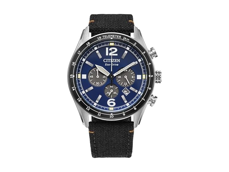 - (1) Citizen Men's Eco-Drive Sport Casual Watch, Black Nylon Strap, Blue Dial, Chronograph, Date (Model: CA4654-12M)