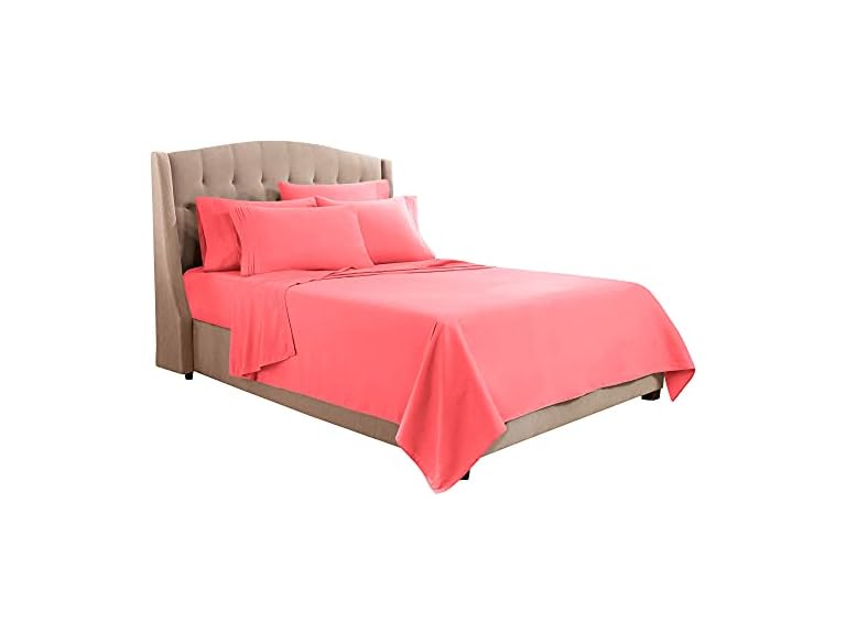 - (1) Clara Clark Bed Sheets, Premier 1800 Series Bed Sheet Set with Extra Set Pillowcases, Deep Pocket Fitted Sheet, Luxury Soft Bedding Sheets & Pillowcases, Flex-Top King, Coral Pink