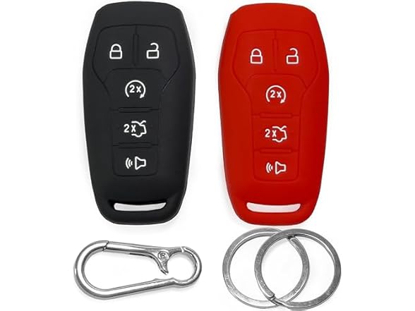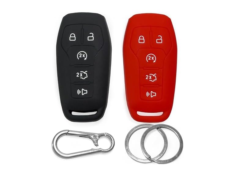 Click&Fit 2-Pack Silicone Key Fob Shell Covers Set 5-BUTTONS, perfectly tailored for Ford and Lincoln owners who want to add a layer of protection and a dash of style to their car keys. Made with top-notch silicone, these covers fit like a glove and provide top-tier defense for your keys, keeping them safe from scratches, damage, and everyday wear and tear. Compatible with Ford selected models: Edge 2015-2017 Explorer 2016-2017 F-150 2015-2017 F-250 2015-2017 Fusion 2013-2016 Mustang 2015-2017. Compatible with Lincoln selected models: MKC 2014-2016 MKX 2016-2019 MKZ 2013-2016. Key Cover Protector compatible with parts No: M3N-A2C31243300, 164-R7989, 164-R7991, 164-R8119. It's important to match your key with the image provided to ensure a perfect fit. It's worth noting that this set includes the silicone covers only, not the key fob itself. Each set comes with 2 silicone covers, 2 key rings, and a carabiner clip for added convenience. Featuring a sleek design and available in vibrant colors. Designed to accommodate a variety of key sizes, they wrap your key in a protective layer, guarding against spills and drops. These key covers aren't just practical; they're a way to express your personal style. With a design that appeals to everyone, they add a unique touch to your keychain. Choosing these Silicone Car Key Covers means opting for a mix of protection, style, and practicality that will make every day a little easier.