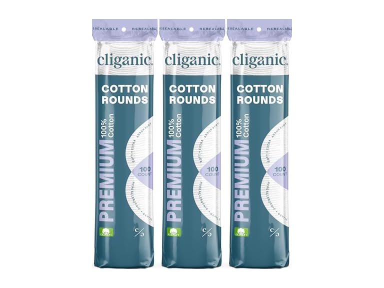 (1) Cliganic Premium Cotton Rounds for Face (100 Count) - Makeup Remover Pads, Hypoallergenic, Lint-Free | 100% Pure Cotton