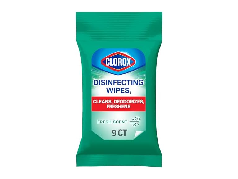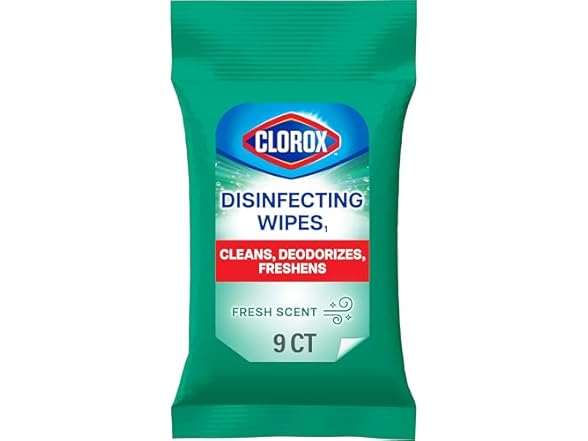 - (1) Clorox Disinfecting On The Go Travel Wipes, Household Essentials, Fresh Scent, 9 Count, Pack of 1 (Package May Vary)