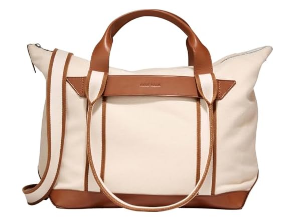 - Coated canvas iwith leather handles, bottom, and trim in Irish Coffee; zip closure.