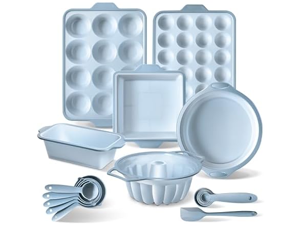 - Complete Baking Set: This silicone baking set with silicone bundt pan, comes with everything you need. It's the perfect addition for bakers looking to expand their silicone bakeware collection. Includes: 12 cup silicone muffin pan, 24 cup mini muffin pan, bundt pan, round cake pan, square pan, loaf pan, silicone spatula and measuring cups and spoons.