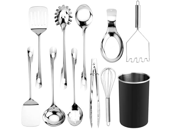- Premium & Food-Grade Stainless Steel: These kitchen utensil sets are crafted from high-quality stainless steel material that has passed food safety and FDA tests. The cooking utensil set is both tasteless and durable. Unlike plastic, these cooking tools don't contain any unhealthy substances, making them an excellent choice for long-lasting use.