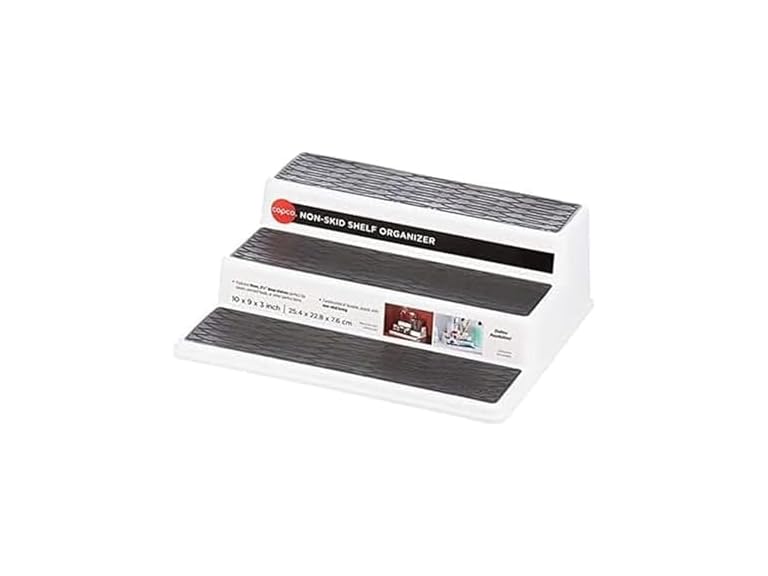 - NON-SLIP SHELVES: The step shelf organizer features a non-slip shelf lining; clean with a damp cloth when needed