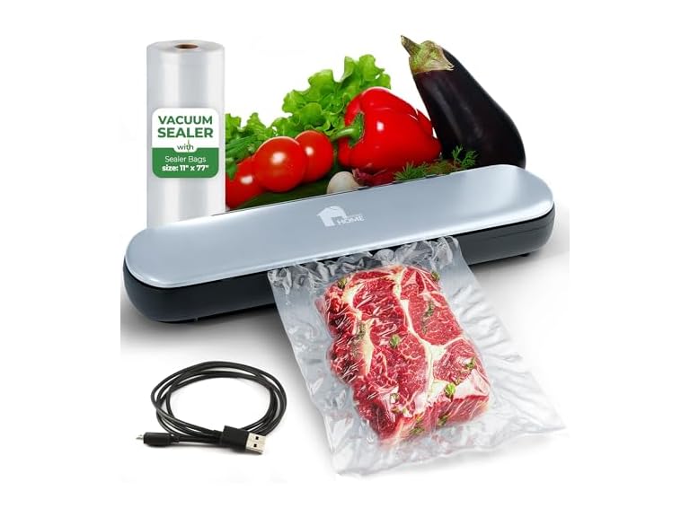 - Vacuum Seal Bags Included - Our vacuum seal machine for food is ready to use right out of the box! That's because the commercial vacuum sealer includes 1 roll of vaccum seal bags measuring 77" x 11".
