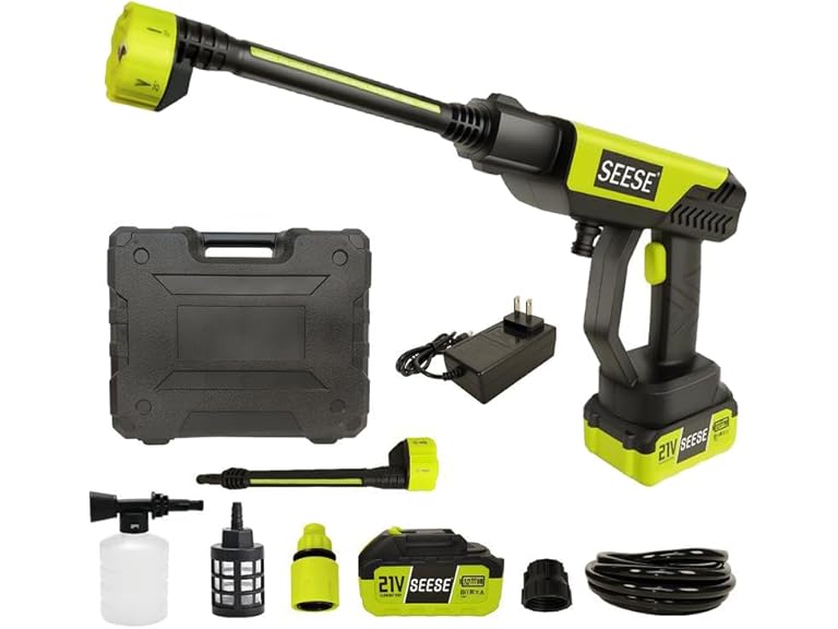 - Are you tired and exhausted after every family deep cleaning, with no energy left for leisure or quality time with your family? The SEESE Cordless Portable Pressure Washer solves this with its powerful water pressure that cuts through dirt quickly and a long-lasting battery that eliminates frequent interruptions. What used to take 2 hours of tiring work now takes just 20 minutes—let you finish cleaning easily and enjoy more relaxed family time.