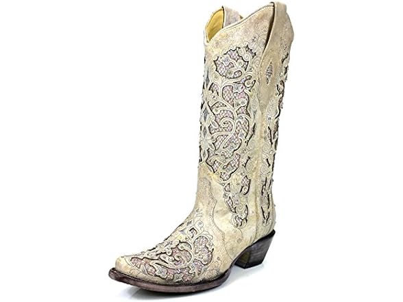 General care At the end of the day, wipe off any loose dust, dirt, or foreign debris. It is abrasive to all types of leather, failure to properly clean the soles, heels, or stitching will eventually cause the leather to weaken causing splits or cracks to occur ruining the overall appearance of the boot. Use a very soft brush or a damp cloth to remove dust, dirt, and debris from crevices, stitching, heels, shaft, vamp, and soles. You may use a slightly damp sponge to remove heavy mud on caked areas where mud has dried. Do not use solvents, gasoline, household, or industrial cleaners to try and remove stains. Do not soak or wash the boots in heavy running water. Remove any excess water as soon as possible with a soft dry cloth and allow to air dry. Do not leave your boots in front of a fireplace, stove, oven, or direct sun, or use a hair dryer to dry. Not doing so could result in mold, discoloration, or premature deterioration of the leather or skin. Apply conditioner with a soft cloth or use your fingers, rubbing the conditioner over your boot in a circular motion. You should not use large amounts of conditioner, soak or glob areas of the boot with the conditioner. The skin can only absorb a certain amount before it becomes saturated, oily, or sticky. Wipe away any excess conditioner with a soft, clean, dry cloth. Boot creams come in many different colors as well as neutral for hard-to-match colors and may contain conditioning agents as well. Apply with a soft cloth or your fingers, using thin layers and multiple applications allowing the boots to absorb the boot cream. This provides a fresh new look and prevents the leather from drying out. You may also want to use boot cream around the edges of the sole and heel to restore worn or scuffed areas. Boot cream or polish is not recommended for scaled boots such as rattlesnake or python. When boots become scratched or scuffed from normal wear, there are a few things you can do to make the scratch or scuffed area less noticeable. Use a wax or cream polish in a color that is as close as possible to the damaged area. Using a soft cloth, apply thin layers of the wax or cream polish, after the wax/cream has dried, brush or wipe away any excess wax/ cream and repeat these steps until you match the damaged area, as close as possible, to the rest of the boot. If boots have become stiff or dried out, you may try leather saddle soap to restore the leather. However, using saddle soap regularly may dull or remove the manufacturer´s designed finish. To store your boots, we recommend the use of boot trees to retain the shape of the shaft and integrity of the last. When not wearing your boots, store them in a cool, dry place, out of direct sun or direct exposure to heating vents. Boots should be conditioned/ polished three to four times a year whether they are worn or simply being stored. Do not store your boots if they are damp, or wet. Ostrich Being a relatively durable skin may be cared for much the same way as earlier discussed in basic care. Alligator, Crocodile, Eel, and Lizard If at all possible, try not to wear exotic skin boots in extremely wet weather conditions, stand or walk in water, or mud. Keep your boots free of dust, dirt, and debris. Apply a light boot conditioner each week when being worn often. If you store your boots for an extended period, it is recommended that you condition them about 3-4 times a year at least. Rattlesnake, Python, Cobra and Other Snakes Boots with scales require a different kind of care. Always wipe with the grain, never against it. From time to time, you may want to use a reptile spray foam cleaner and conditioner on your boots, to lift dirt or debris from the scales, wiping away any remaining residue with a soft cloth. Distressed Leather Do not use wax or cream polish on this type of leather. To keep your boots looking as they were designed, use a soft damp cloth to wipe away any dust or debris. If you want a little more luster on this type of finish, try applying a neutral color boot cream and buffing it out with a soft brush. Suede Requires a little extra care to keep clean and remain soft and supple. Use a suede brush to clean everyday dirt, dust, or loose debris from boots. Do not wear suede boots in the rain, sleet, or snow. Should your boots become wet or damp, use a dry terry cloth towel and allow the boots to dry at room temperature. Do not Place boots near a fireplace, stove, or other heat sources. Once the suede has dried, use a suede brush, or dry terry cloth to gently rub the suede back and forth to raise the nap. Do not use any harsh cleaning solvents Download PDF A3322 - WOMEN'S WHITE GLITTERED INLAY AND CRYSTALS SNIP TOE WEDDING COWBOY BOOT Glitzy, stunning, and elegant. Beautiful white boot with glitter applications perfect for that special day. These beauties will sure to compliment your wedding dress and you on that special day. The 13-inch shaft filled with glitter inlay intricated embroidery and carefully placed crystals complement each other and your outfit. This is a style you can wear all day without worrying about getting tired. It features; sturdy pull-on straps and an elegant snip toe. The smooth inside leather lining, cushioned leather insole, leather outer sole with a rubber heel cap, and 2-inch stacked heel, scream comfort.