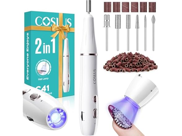 - Professional Nail Drill Set, Perfect for Nail Enthusiasts: Whether you're a beginner or an experienced nail technician, COSLUS C41 professional electric nail drill set with a built-in handheld nail lamp is a great choice for anyone passionate about manicure and pedicure. Equipped with a variety of accessory heads, it meets all your nail care and design needs. (Note: The mini nail lamp is designed to cure one fingernail at a time.)
