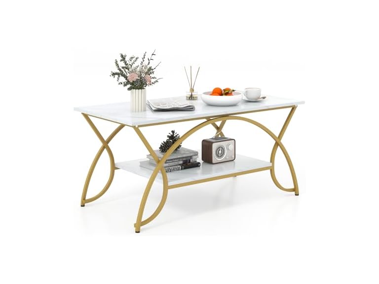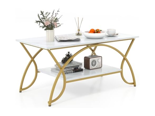 - 【Stylish Arched Coffee Table】The coffee table features a white faux marble tabletop that gives a chic and luxurious look. Paired with the sleek golden frame, the contemporary coffee table can match the existing room furniture of different styles and add to a modern flair to your living room.