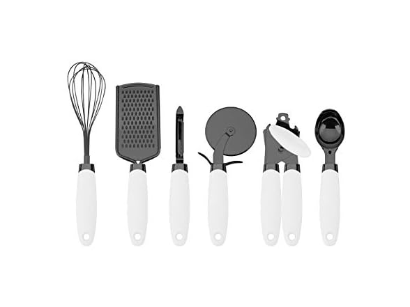 - Country Kitchen 6 Pc Essentials Kitchen Stainless Steel Gadget Set Black Gun Metal with Soft Touch White Handles for Cooking