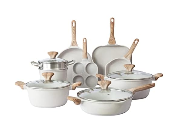 - SET INCLUDES - A complete kitchen essentials set, you're getting a total of 13 pieces. Including an 8 qt casserole pot with glass lid, a 4 qt casserole pot with glass lid, a steamer, an 11” frying pan, an 8” frying pan, a 11" deep frying pan with glass lid, a 2 qt sauce pan with glass lid, a 11" griddle, and a 4 slot egg pan. These beautiful cookware sets are designed with a speckled coating and woodlike handle. Not only functional, but these sauté pans are decorative as well.