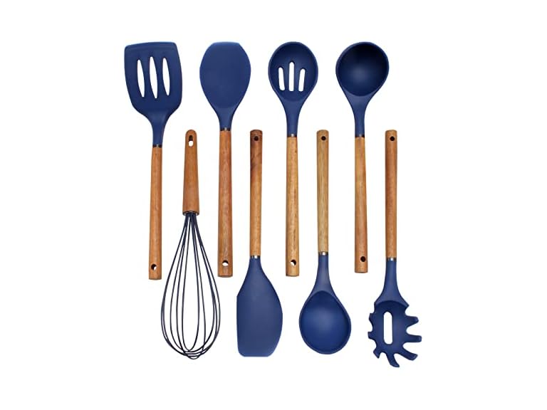 - Country Kitchen Non Stick Silicone Utensil Set with Rounded Wood Handles for Cooking and Baking, 8 Piece Set, Navy