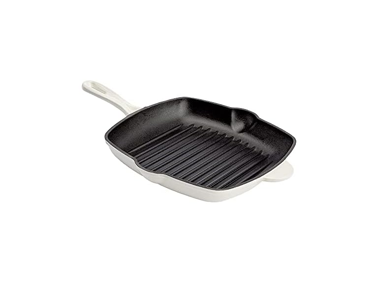 - Country Living Enameled Cast Iron Square Griddle Grill Pan with Ridges, Helper Handle and Pouring Spouts for Easy Draining, Indoor Grilling Skillet, 11-Inch, Cream