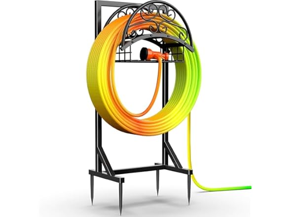 - Storage Basket Included - This garden hose holder comes with a convenient storage basket to keep gardening tools like nozzles and gloves organized, or store other essentials. Keeps everything neat and within easy reach.