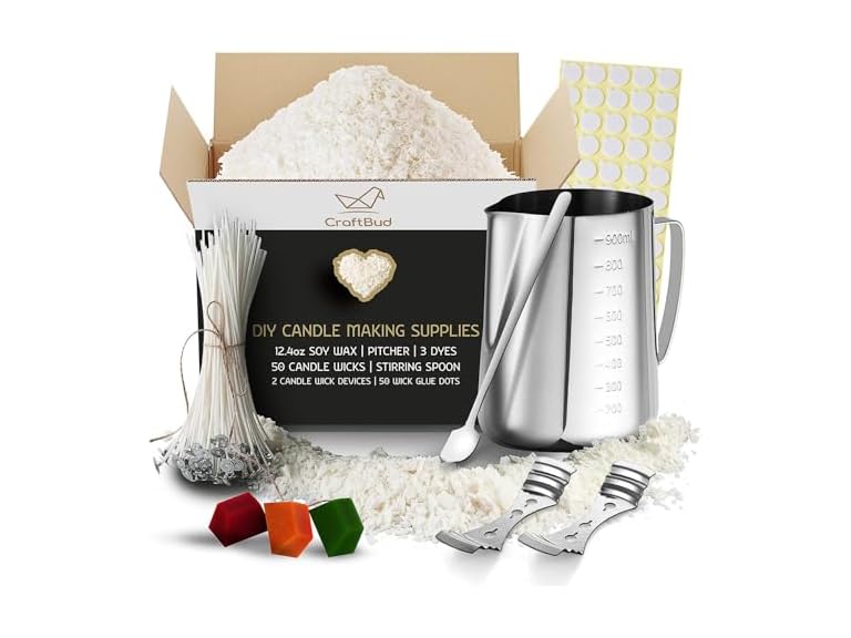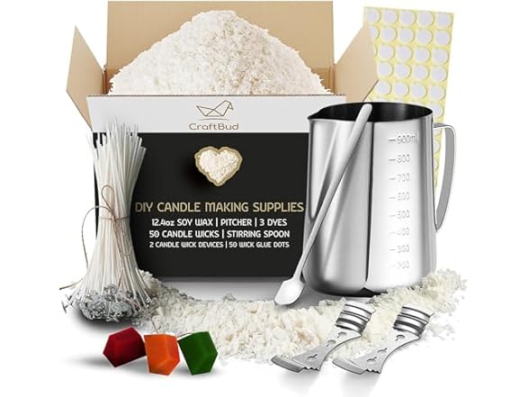 - (1) CraftBud 108 Piece DIY Soy Candle Making Kit for Adults & Kids, Include 12.4Oz Soy Wax, Wax Melter, Wicks, Dyes & More