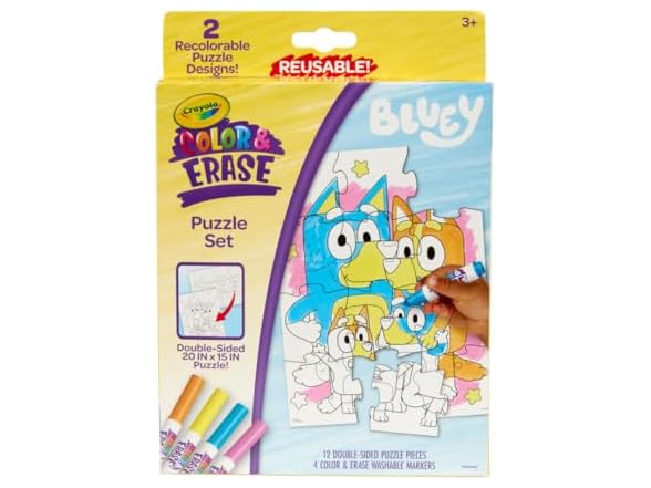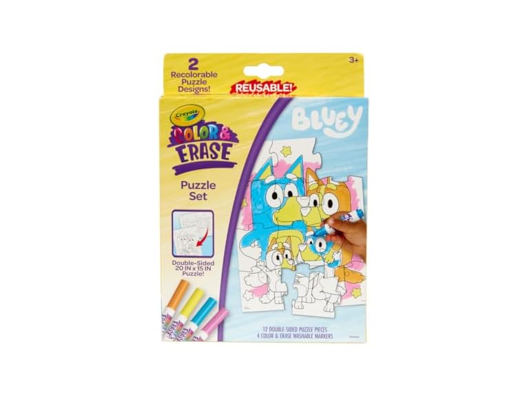 - CRAYOLA COLOR & ERASE RECOLERABLE PUZZLE: Includes 12 Double Sided Bluey Puzzle Pieces (6" x 6"), and 4 Color & Erase Washable Markers.