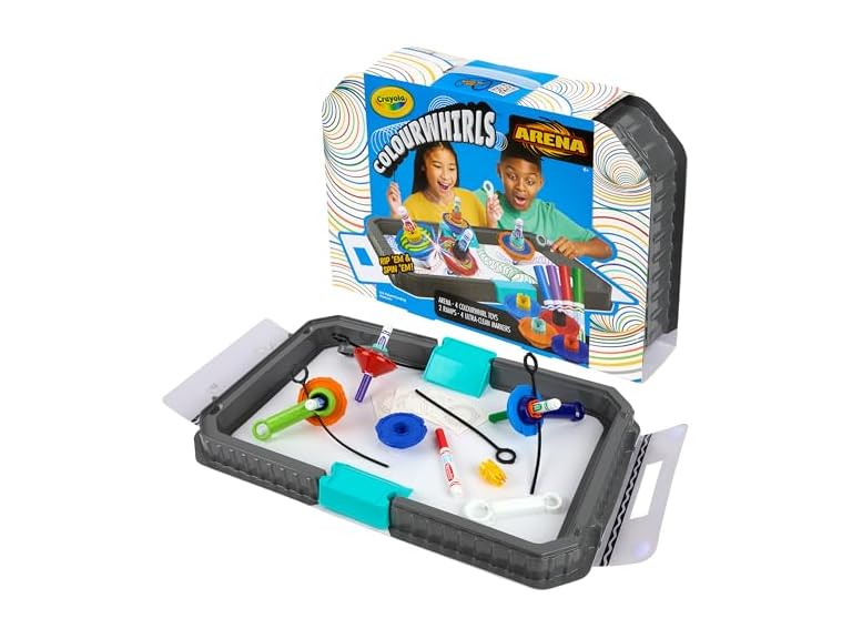 - (1) Crayola Colourwhirls Battle Arena Art Game, DIY Gyro Spin Art Toy, 4 Battling Spinning Top Toys, Birthday, Holiday for Kids, Ages 6+