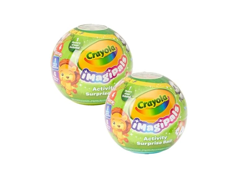 - CRAYOLA IMAGIPALS SURPRISE BALLS: This set includes 2 Animal-Themed ImagiPals Surprise Balls, 4 Crayola Crayons, 1 Sticker Set, 1 Basecard, 1 Animal-Shaped Eraser, 1 Collectable Coloring Sheet, and 1 Collectable Card/Assembly Sheet.