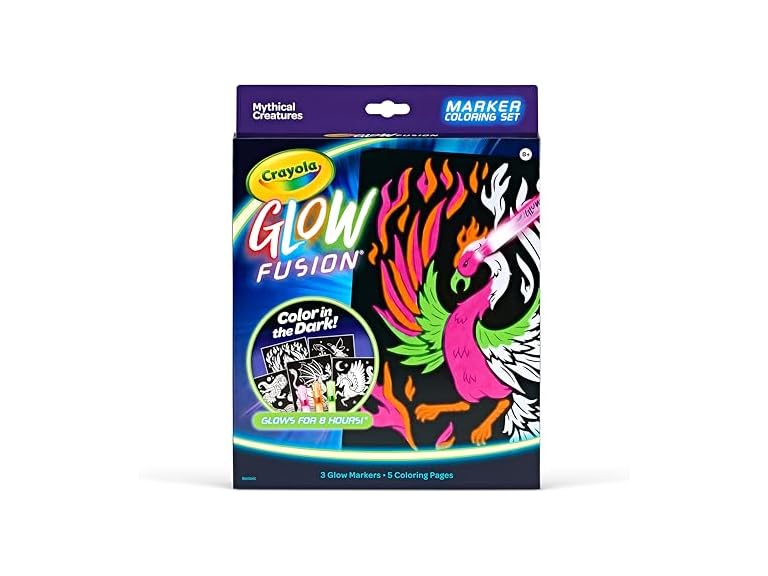 - (1) Crayola Glow Fusion - Mythical Creatures, 3 Glow Markers, Glow in The Dark Coloring Set, Kids Coloring Pages, Glow Toys, Gifts for Kids