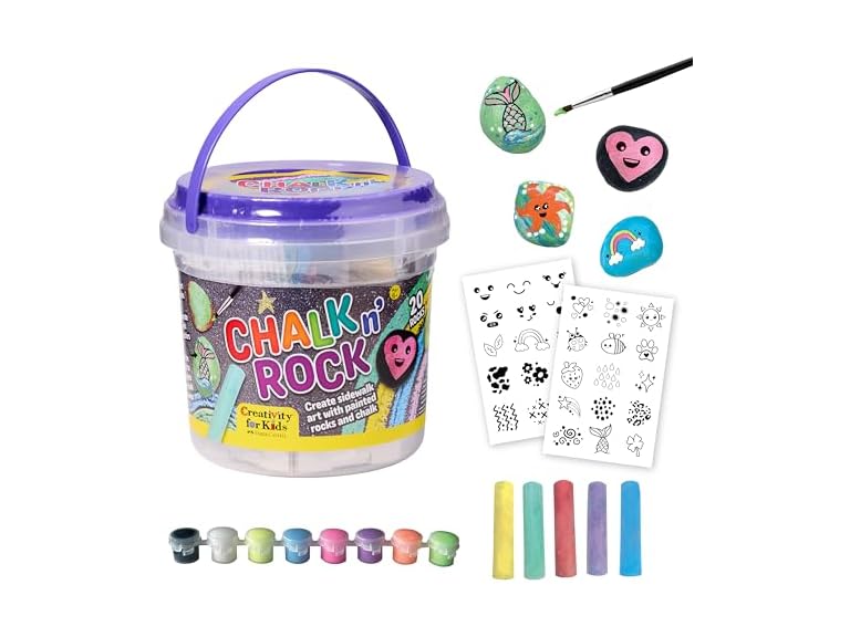 - SIDEWALK ART ADVENTURE: Who left a rainbow trail on my sidewalk?! Bring the viral rock-and-chalk trend to life with the Creativity for Kids Chalk n’ Rock Bucket! This collaborative outdoor art kit invites families to paint, decorate, and chalk around 20 rocks to build creations. Packed in a reusable bucket, it’s great for classrooms, parks, groups, and neighborhood fun—perfect for outdoor activities for kids