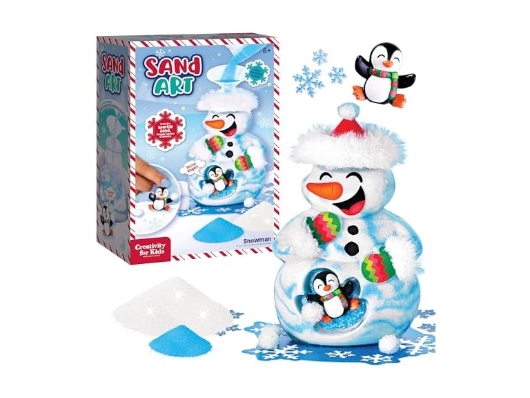 - CREATE A SPARKLY SNOWMAN SCENE: Step into a festive world of imagination with the Creativity for Kids Sand Art Snowman Kit!. Pour colorful sand, decorate with stickers, and add fun accents like snowflakes and pompoms. Watch each snowy scene come to life as kids personalize every detail. A Christmas craft for kids ages 6–8+ and a fun holiday gift option, perfect for families looking for winter crafts for kids