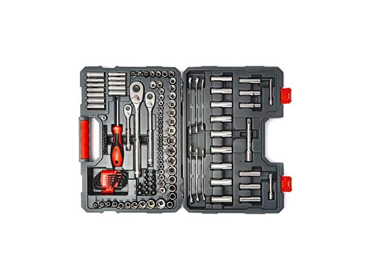 Crescent 142-piece professional tool set contains a carefully selected assortment of Crescent brand hand tools needed for most industrial, mechanical, and consumer applications. The set includes 1/4", 3/8", and 1/2" drive quick-release ratchets with a wide selection of standard and deep sockets in the most common SAE and metric sizes. Included in the set are the following 3/8-inch drive tools: a 72-tooth quick-release ratchet drive, 3-inch and 6-inch extension bars, 24 twelve point sockets and 15 six point deep sockets (SAE and metric). It also includes the following 1/4-inch drive tools: a 60-tooth quick-release ratchet drive, a 1/4-inch bit adapter, 3-inch extension bar, 23 six point sockets and 12 six point deep sockets (SAE and metric). It also includes the following 1/2-inch drive tools: a 72-tooth quick-release ratchet drive, 5-inch extension and 8 twelve point sockets (SAE and metric). As well as 6 combination wrenches (SAE and metric) And an acetate magnetic bit driver with 10 driver bits and 12 hex nut setter bits (SAE and metric). 24 hex keys with tilt-out caddy in both SAE and metric are provided as well. All tools in this industrial quality tool set meet stringent new ANSI and ASME specifications and come with a full satisfaction guarantee.