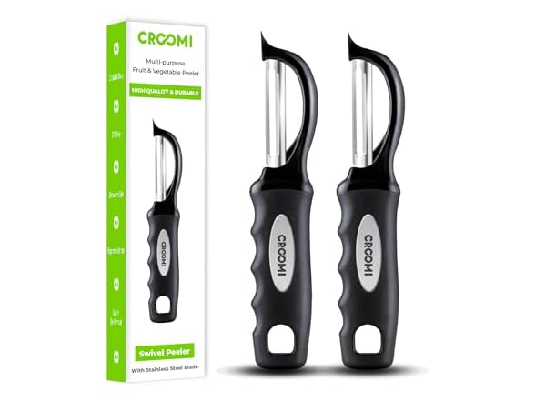 - (1) Croomi Premium Swivel Vegetable Peeler for Kitchen - Apple Peeler with Razor Sharp Stainless Steel Blades, Potato Peelers with Blemish Remover, Veggie Peeler with Strong Ergonomic Handle (2, Black)