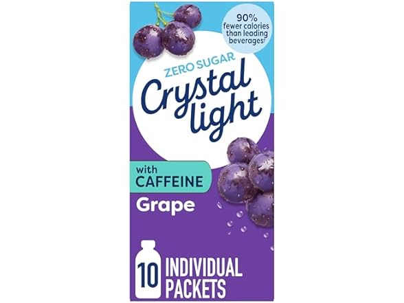 - DRINK PACKETS: One 1.1 oz box that contains ten 0.11-ounce packets of Crystal Light Grape Natural Flavor With Other Natural Flavor On-the-Go Powdered Drink Mix with Caffeine