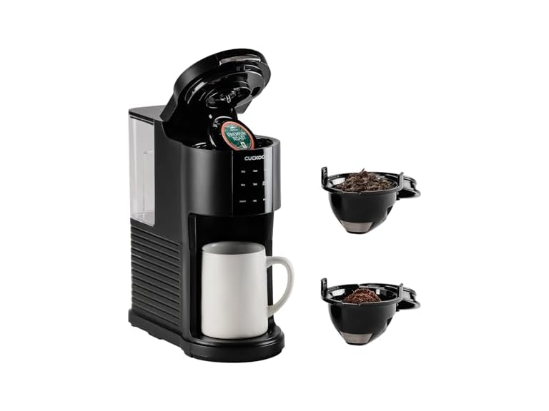 - (1) CUCKOO Single Serve Coffee Maker for K-Cup Ground Beans & Loose-Leaf Tea, Versatile 3-in-1 Pod Coffee Maker, Small Single Cup Machine with 5 Sizes and Auto-Clean Mode (CCM-AK011B)