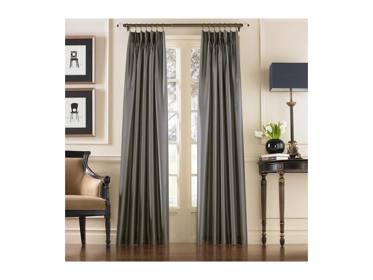 - (1) Curtainworks Marquee Faux Silk Pinch Pleat Curtain, 1 Panel, 30 by 95", Pewter