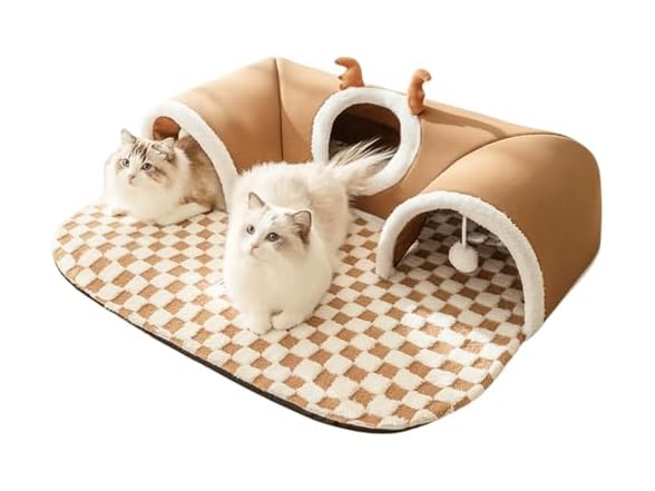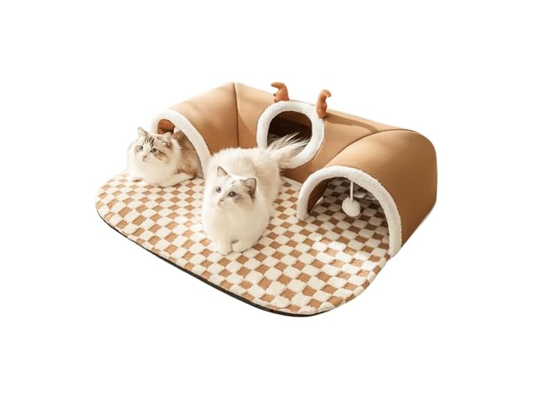- (1) Cat Tunnel Bed Indoor, Peekaboo Cave Bed for Multiple Cats,Kitty Tube with Balls Toys,Removable Cat House Washable,Small Animal Tunnel for Kitty,Bunny (Brown,Small)