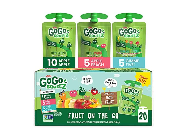 - (1) GoGo squeeZ Fruit on the Go Variety Pack, Apple, Peach & Gimme Five!, 3.2 oz (Pack of 20), Unsweetened Fruit Snacks for Kids, Gluten Free, Nut Free and Dairy Free, Recloseable Cap, BPA Free Pouches