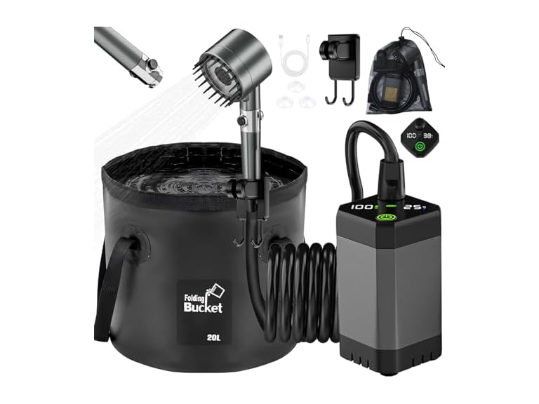 - [The Best Choice for a Camping Essentials]: The portable outdoor shower set includes 1 shower pump, 1 output hose, 1 shower head, 1 storage bag, 1 20L folding bucket, 3 suction cups, and 1 charging cable. This battery operated shower is suitable for indoor/outdoor showers, camping, barbecues, hiking, beaches, travel, bathing, pet baths, car washing, plant watering and more indoor and outdoor uses. It offers convenience for all outdoor needs and is an excellent gift for outdoor enthusiasts.